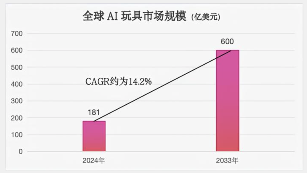 数据也很会配合。IMARC的报告显示,2024年全球AI玩具市场规模已达181亿美元,预计到2033年将增长至600亿美元。这意味着:哪怕它只从传统千亿美元玩具盘子里抢下一角,也足够撑起一个「潜力股」的估值故事。