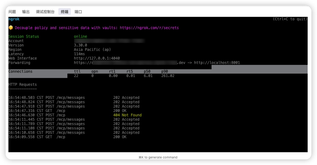 第三步:按照官方文档的建议,使用 gnork 工具把本地服务暴露(也就是穿透),确保 ChatGPT 可以连接到本地测试环境(有服务器且有SSL证书的话可以直接部署到线上)。