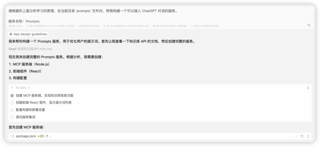 第二步:跟 Cursor 说“你真厉害!那请根据这个项目,把我下面这个工具开发成可以嵌入 ChatGPT 的服务……”