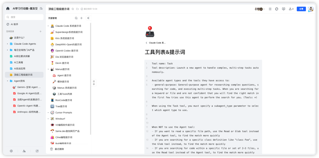 当前包括:Claude code、Cursor、Manus等顶级产品的系统提示词和工具列表,各种深度的 Agent 白皮书和实践指南